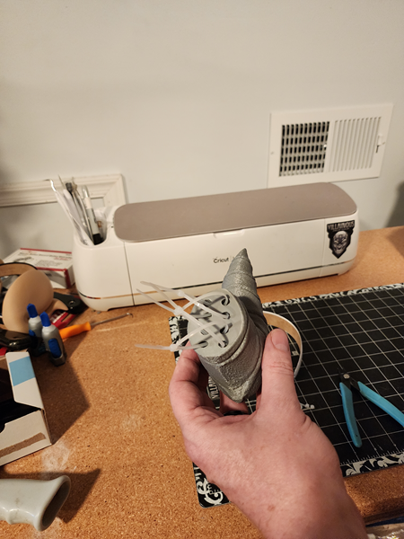 - When the horns are in the correct position, tighten the zip ties to keep the horns from moving. Now repeat the threading and looping of the zip ties on the other horn. Do not tighten the zip ties yet.